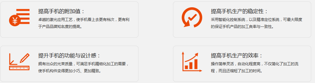 随着微电子工业的技术进步和人们对手机个性化的追求的不断提升,促使手机行业正在朝着集成化、高精密化的方向发展,其产品构件越来越小巧,加工工艺也越来越复杂。作为激行业的先驱者荣科激光依托自身技术优势,将激光应用与代的手机制造工艺进行了有机结合解决了现在手机行业生产中的众多难题,例如:手机外壳切割、主机板制造、键盘芯片标记及听筒、耳机、饰件的雕刻与打孔等等。弥补了传统工艺的不足,为您的手机制造加工提供了更精密、高效的加工解决方案。同时先进的激光应用技术,为您提供了完备的激光应用工艺,不仅满足您多样化的加工需要,而且还为您加工生产带来更可观的经济收益。