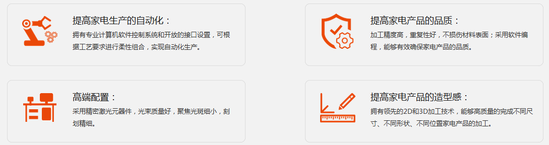 利润率的下降,劳动密集型产业——家电制造产业转型升级迫在眉睫,智能制造、先进的激光加工仍是各企业近两年所追求的。原来的低成本、大规模的发展模式已经不可持续,向高端化、智能化转型升级已经成为整个家电行业的突破口。在家电行业转型升级的背景下,荣科激光凭借着激光焊接、激光打标、激光切割的等创新应用工艺,将激光加工技术有效的应用到现在的家电制造中,例如应用于洗衣机、冰箱、空调等的合金箱体切割与焊接,模具的深雕、清洗;家电外壳操作指示、品牌标识的打标;金属件及塑料配件的钻孔、切割;电器内部电路板微钻孔、微焊接等。为现在的家电制造提供了更高效、更精密的加工解决方案。